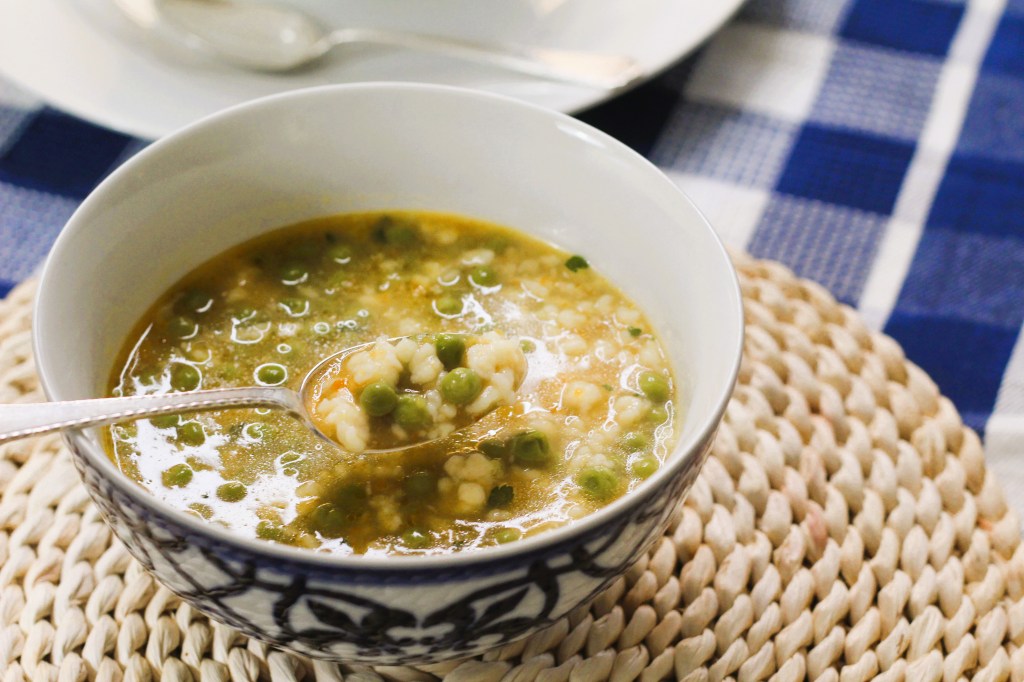 The broth is called “crazy” because it’s not the usual slow-cooked broth — it’s made by blending a carrot, a celery stalk, and a small leek or onion in water. You heat it up with a tablespoon of tomato paste, a cup of peas, and after half an hour, you add the pasta: manfettini, made fresh in the food processor with one egg and 100 grams of flour.