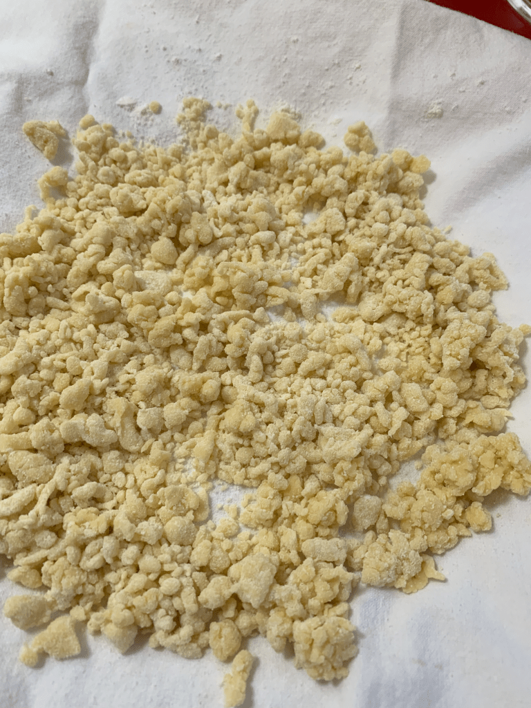 At this point, with the machine running, pour in the extra 2 tablespoons of flour all at once and pulse for just 5–10 seconds — this will produce many tiny dough balls. The manfettini are ready.