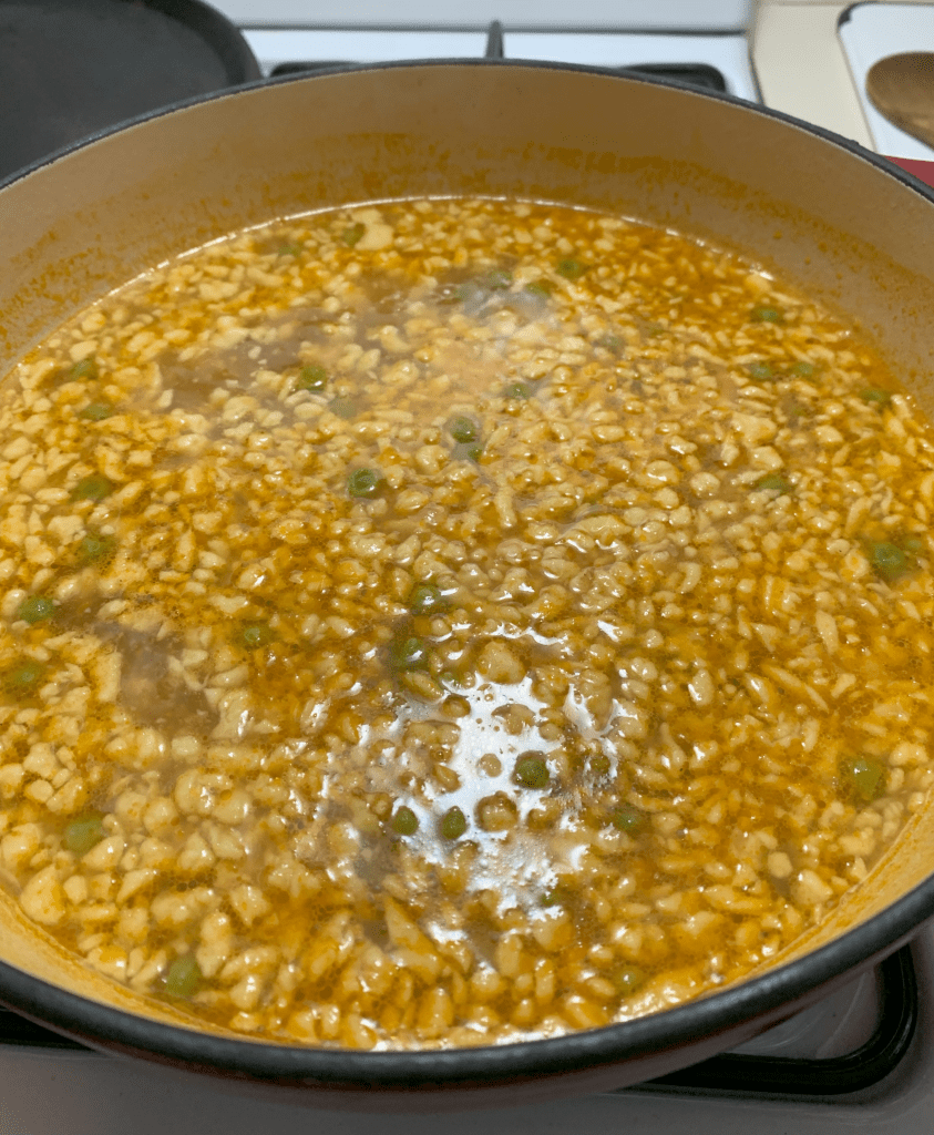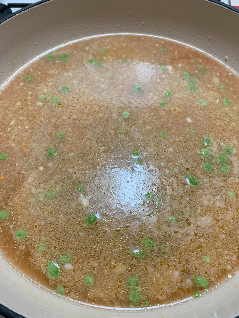 Pour this into a pot with the olive oil, tomato paste, and peas. Cook for a few minutes, then add the remaining water and adjust with salt. Simmer for about 30 minutes.