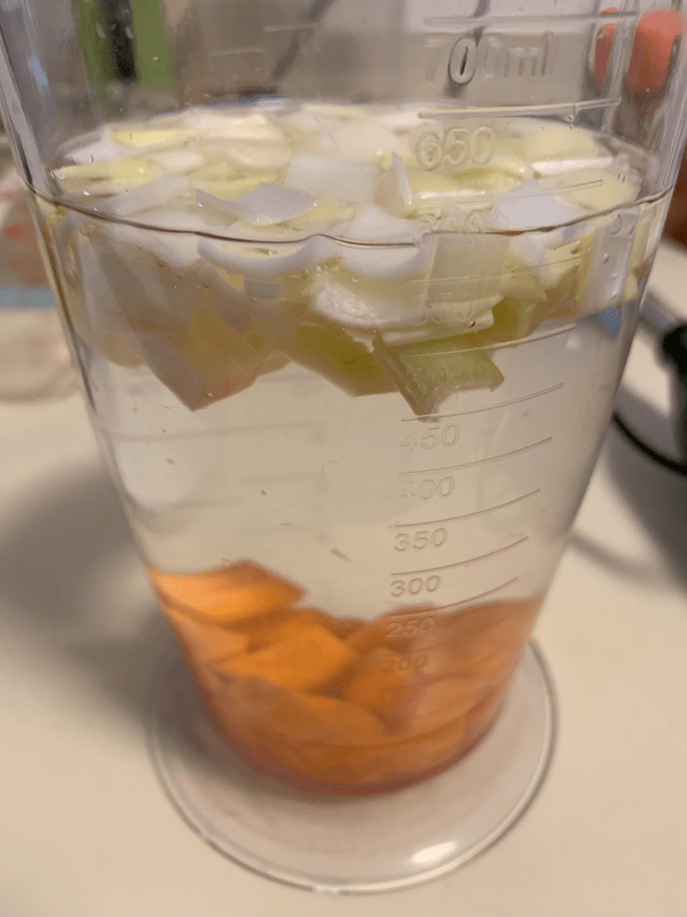 With an immersion blender, finely blend the celery, carrot, and onion together with half of the water. You’ll get a sort of raw vegetable purée.