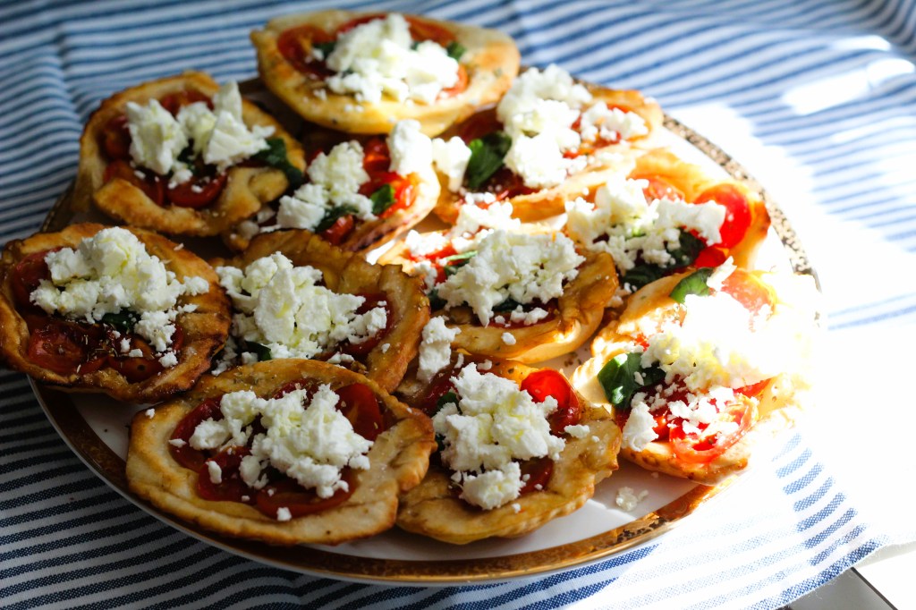 Arrange five tomato halves in a circle for each tart (do not salt the tomatoes yet, or they’ll release water instead of caramelizing).