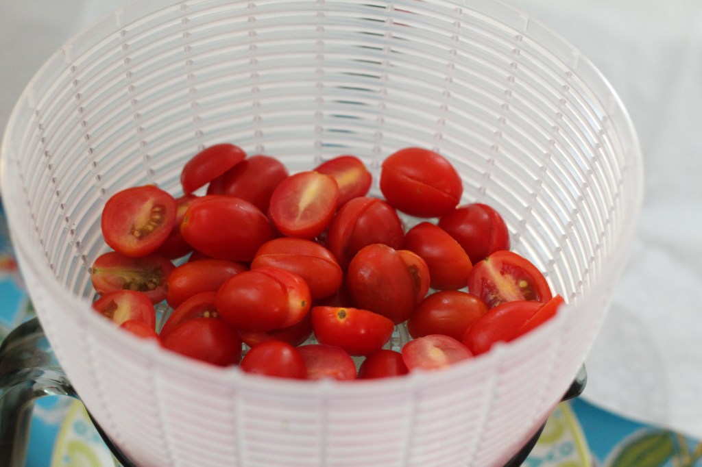 Wash the cherry tomatoes, cut them in half, and let them drain in a colander.
