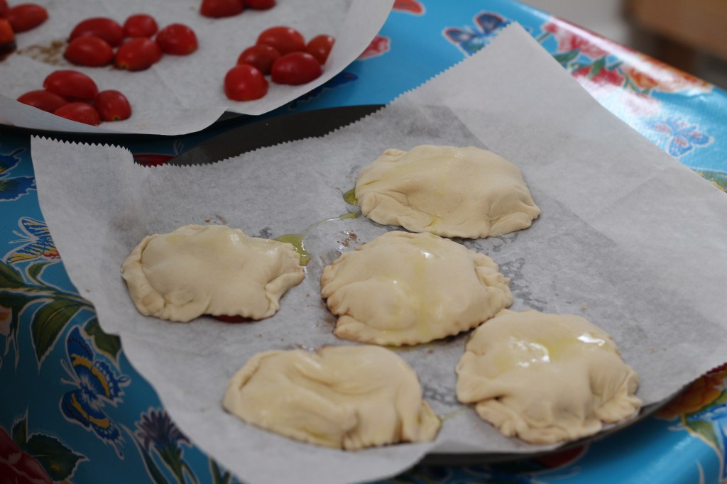 Press one rectangle over each tomato group, sealing the edges well around the tomatoes.