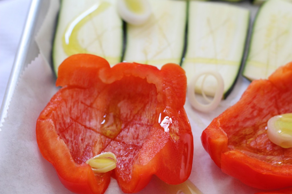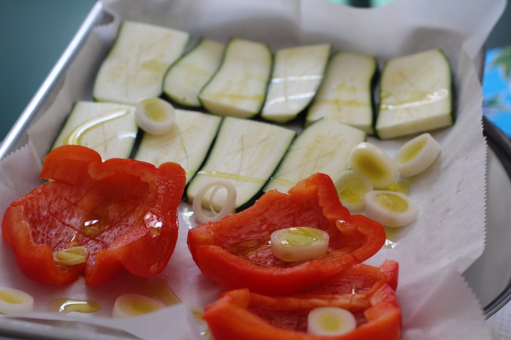 Line a baking tray with parchment paper, brush lightly with olive oil, and arrange the vegetables in a single layer. Do not add salt at this stage, as it will cause the vegetables to release water. Bake for about 10-15 minutes, then season with salt.