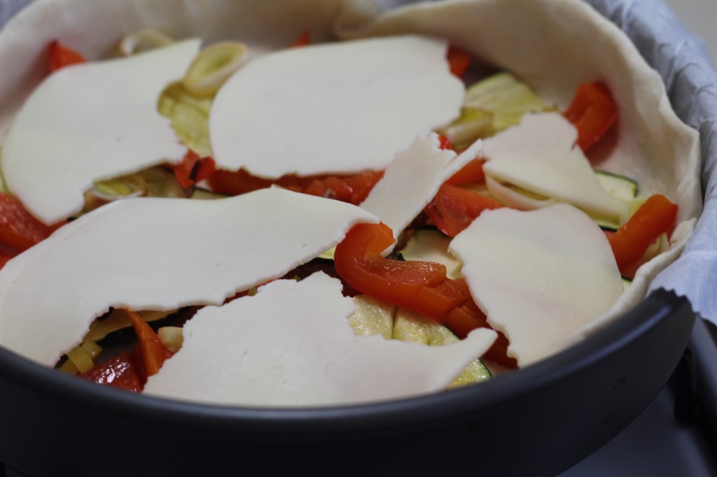 Distribute the cooked vegetables evenly over the crust. Top with cheese slices.