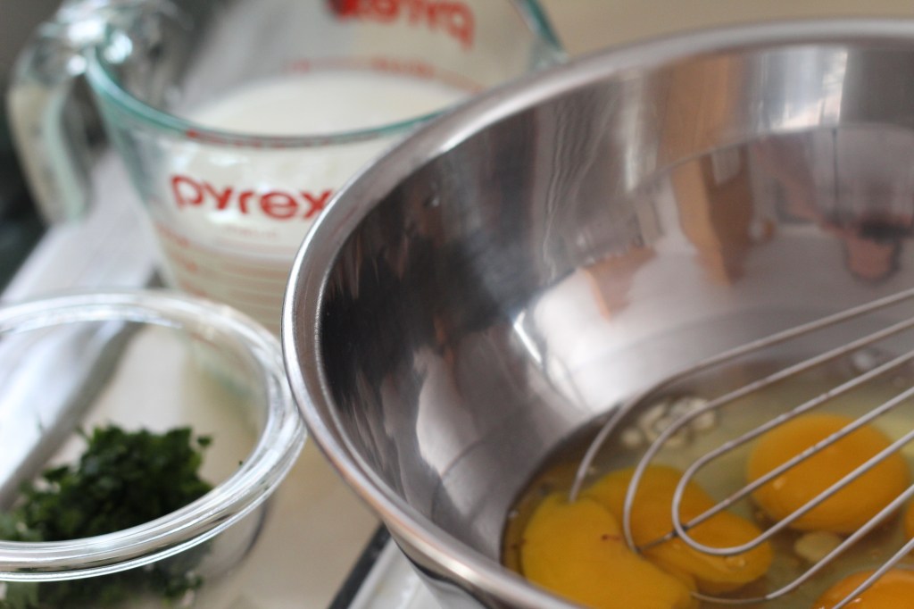 In a bowl, whisk together the eggs, milk, chopped parsley (optional), and grated cheese. Season with salt and pepper. Pour the mixture over the vegetables.