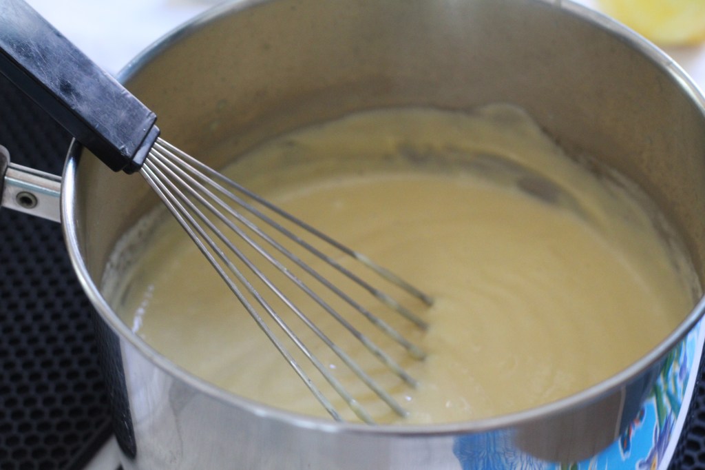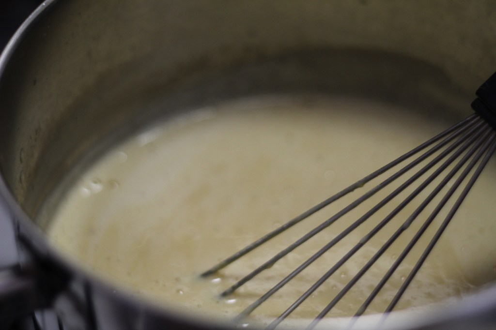 Pour everything back into the saucepan and cook over low heat, stirring with both a whisk and a spatula, making sure it doesn’t stick to the corners.