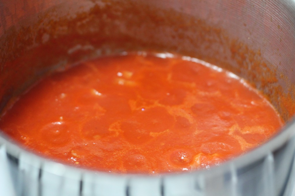 The emulsified tomato sauce has many advantages. First, you can use whole peeled tomatoes and visually check their quality. The color and natural sweetness of this variety make the sauce flavorful and fresh without the need for extra ingredients. Also, the emulsification technique blends the tomato thoroughly, making the dish smooth and pleasant even for those who don’t like tomato seeds or small pieces of onions or leeks.