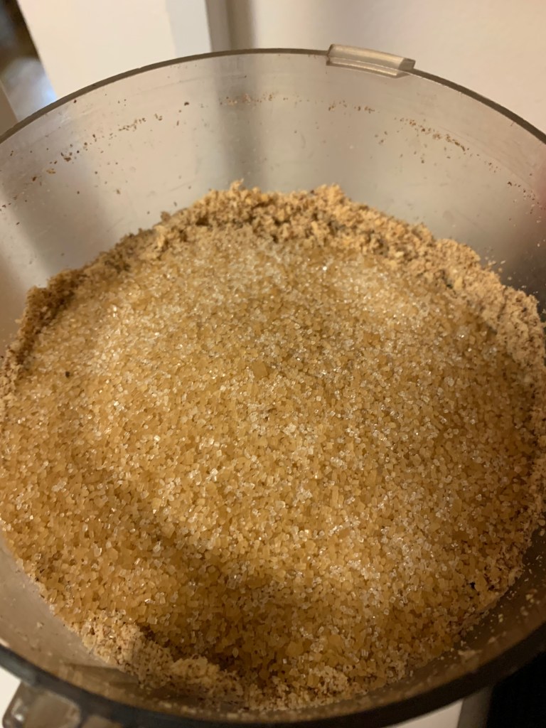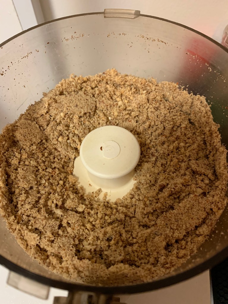 Toast the nuts in the oven, let them cool down. Pass them through a food processor with a tablespoon of granulated sugar and chop them fairly finely, then add the remaining sugar.